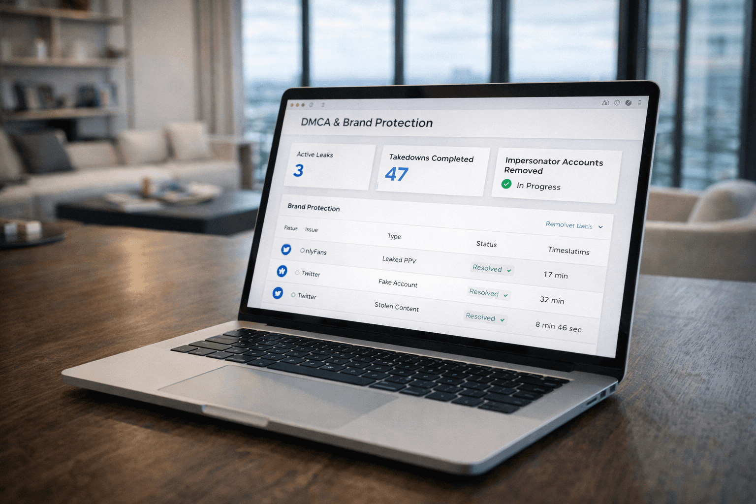 Leaks, fake pages, stolen PPVs, and impersonators kill momentum. We actively monitor, document, and take down anything that touches your brand or revenue — fast. Protection isn’t optional at scale.